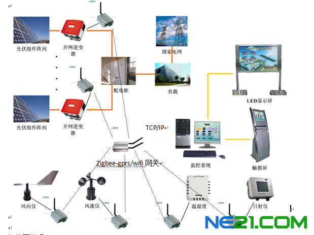包括汇流箱、逆变器、气象仪等需要监测的设备有线连接zigbee无线串口设备,经由底层zigbee无线传感器网络至zigbee转GPRS/WIFI网关设备,将数据通过TCP/IP连接至监控中心。