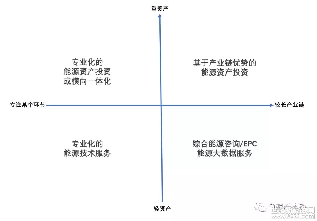 纵轴代表着资产配置的轻重,从没有资产的轻服务,到包含大中型能源基础设施的重资产投资。