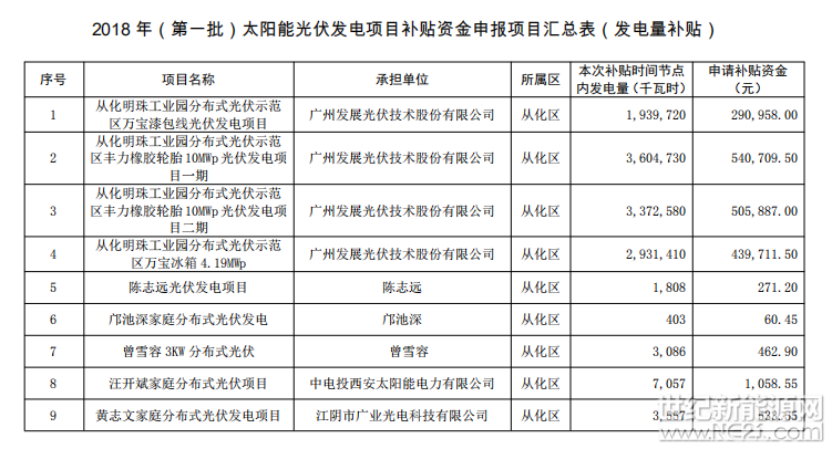根据《广州市新兴产业发展资金管理办法》(穗府办规〔2017〕7号)和《广州市发展改革委关于印发广州市新兴产业发展资金管理办法配套实施细则的通知》(穗发改规字〔2017〕3号)精神,广州市发改委于2017年12月印发了《广州市发展改革委关于组织开展2018年(第一批)太阳能光伏发电项目补贴资金申报工作的通知》(穗发改〔2017〕1001号),经项目征集、资料审查等程序,广州市发改委将拟支持的2018年(第一批)太阳能光伏发电项目补贴资金名单予以公示。