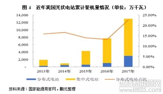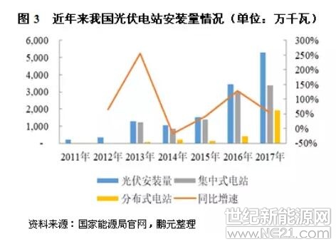 国内光伏电站装机量方面,随着国内光伏行业整合、过剩产能出清,2014年光伏制造企业逐渐从亏损中走出,但由于上半年地面电站审批仍暂停、分布式光伏以市场为导向的商业模式仍未完全建立,当年新增装机同比增速仍回落至-17.96%。自2015年下半年以来,我国光伏行业在国家光伏电价补贴将于2016年6月开始下调的影响,在抢装效应下市场景气度出现了超预期回升。2015年,我国光伏总装机量达到了43.18GW,新增装机容量15.13GW,成为全球光伏发电装机容量最大的国家。2016年我国新增光伏装机容量34.54GW,累计装机容量77.42GW,新增和累计装机容量均为全球第一。2017年新增光伏装机量53.06GW,同比增长53.62%,其中集中式光伏电站33.62GW,同比增长10.92%;分布式光伏电站19.44GW,同比增长3.7倍,占比达36.64%,同比大幅提升。从新增装机布局看,由西北地区向中东部地区转移的趋势明显。华东地区新增装机14.67GW,同比增加1.7倍,占全国的27.7%;华中地区新增装机为10.64GW,同比增长70%,占全国的20%;西北地区新增装机6.22GW,同比下降36%。截至2017年末,我国光伏累计装机容量130.48GW,集中式光伏电站和分布式光伏电站装机容量分别为100.59GW和29.66GW。总体来看,2014年以来我国光伏装机量维持较高速增长。