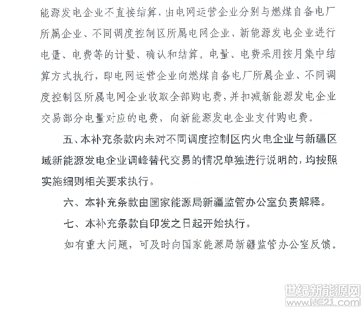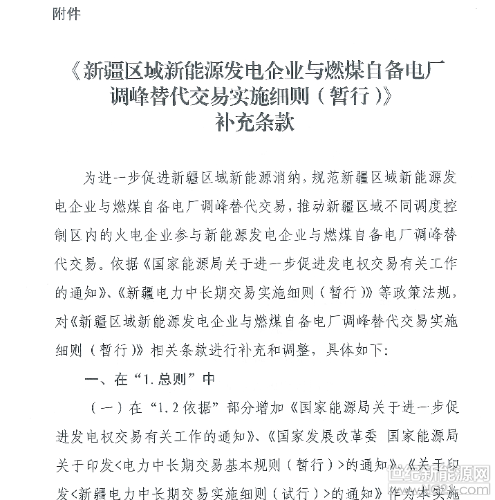 关于印发《新疆区域新能源发电企业与燃煤自备电厂调峰替代交易实施细则(暂行)》补充条款的通知