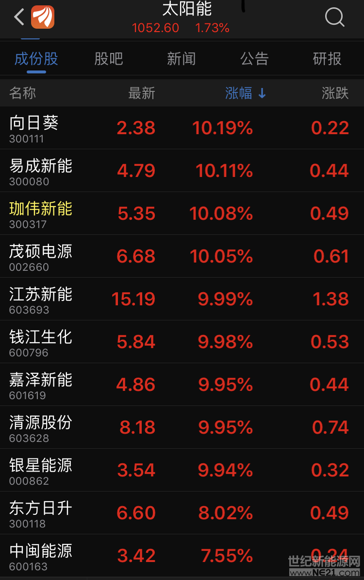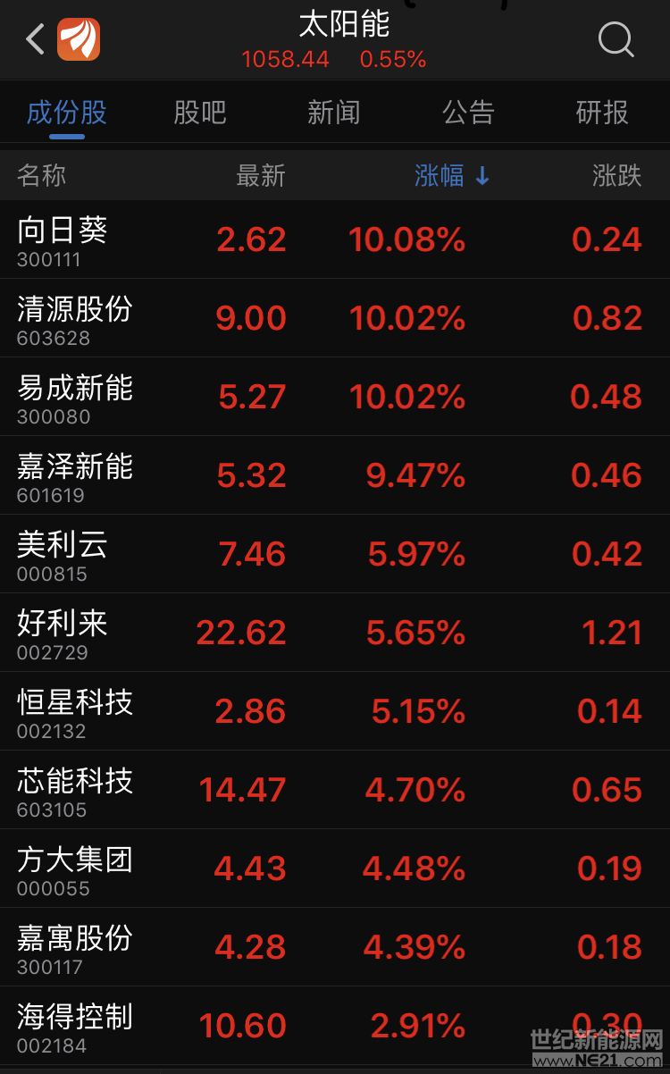 《通知》发布的第二个交易日,向日葵、清源股份、苏美达、易成新能、罗博特科、江苏阳光、云意电气等7股涨停,其他恒星科技、芯能科技、嘉寓股份等大涨。