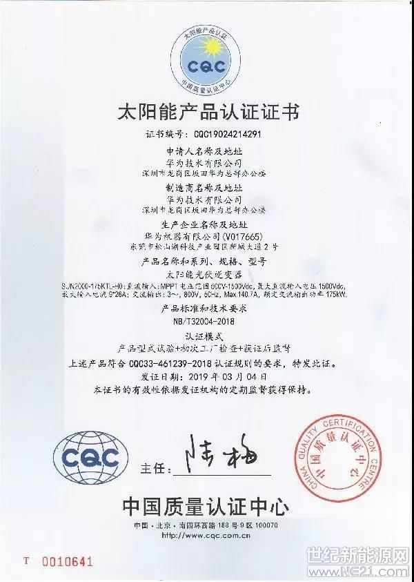 颁证仪式上,CQC相关负责人表示:“从全球市场来看,1500V已经成为大型光伏电站的主流趋势。很高兴看到华为的1500V组串式光伏逆变器率先通过测试并获得CQC首证,再次证明了华为在全球光伏领域的技术领先优势,同时希望华为能够引领我国光伏产业向更高端方向迈进。”