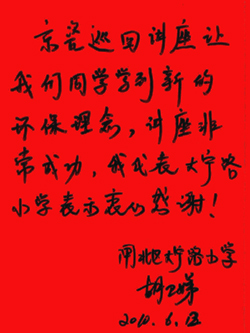 此次举办讲座的上海市大宁路小学三年级学生在学习后的心得中写到“通过学习认识到了太阳能电池板对环境的贡献,我们不能浪费有限的资源,让我们从小事做起一起保护美丽的地球,”。另外,胡校长也表示“京瓷巡回讲座让我们同学学到新的环保理念,讲座非常成功,我代表大宁路小学表示衷心感谢”。