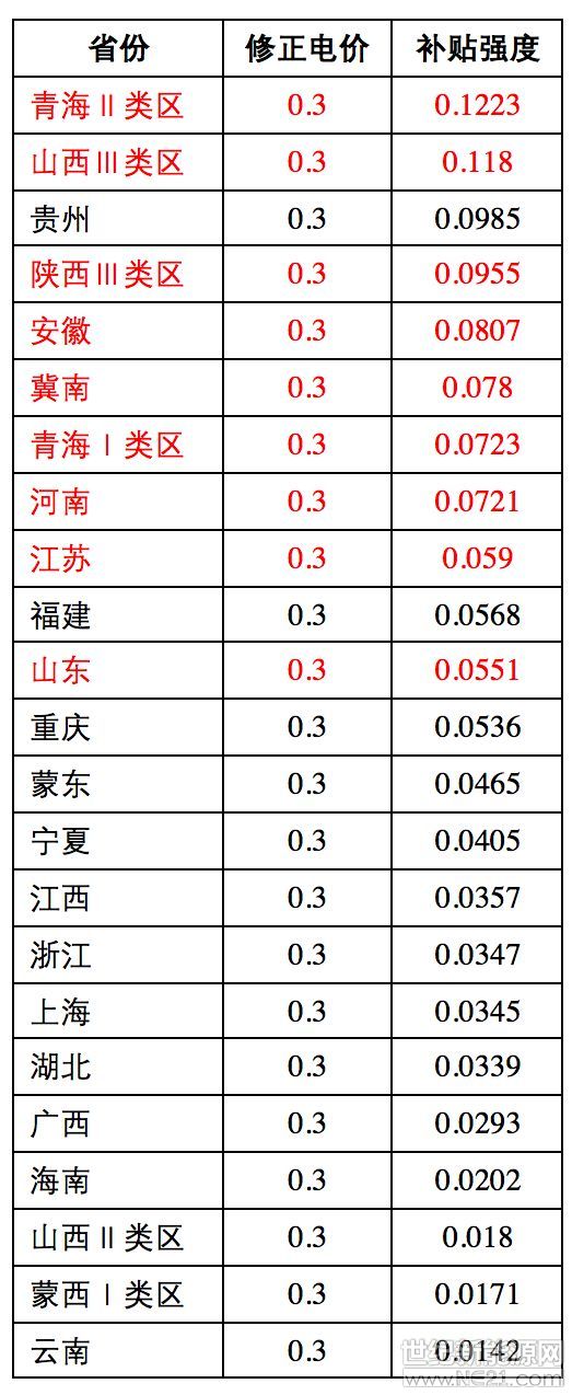 表:降价0.1元/kWh后,部分省份的补贴强度(元/kWh)