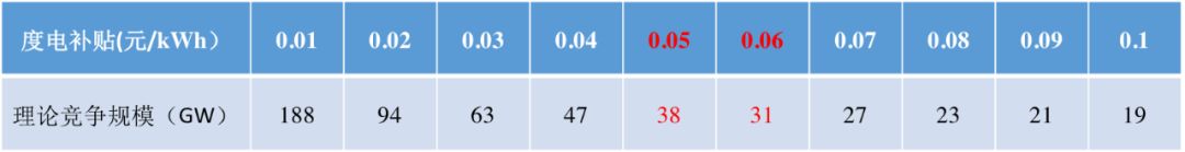 考虑到两类项目一定比例的中标,加权平均后,最终的补贴强度可能是5~6分/kWh。按照22.5亿的补贴盘子,1200小时的利用小时数反算,不同补贴强度下的反算规模如下表所示。