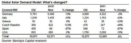 However, Barclays Capital does not see significant growth in 2011, due in part to the impact of feed-in tariff changes in the hot European markets. However, it has revised upwards its forecast for the U.S. next year. Barclays Capital expects the U.S. market to top 2GW in 2011, up from 1.75GW previously forecasted.