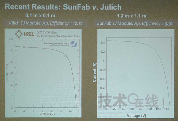 美国应用材料在PVJapan开幕前一天举行了记者招待会,作为薄膜硅太阳能电池方面的最新成果,宣布0.1m×0.1m模块的转换效率达到了10.1%,1.3m×1.1m模块的转换效率达到了9.9%。0.1m×0.1m模块的数值是美国国家可再生能源实验室(National Renewable Energy Laboratory)测定的结果,1.3m×1.1m模块的数值是美国应用材料自己测定的结果。