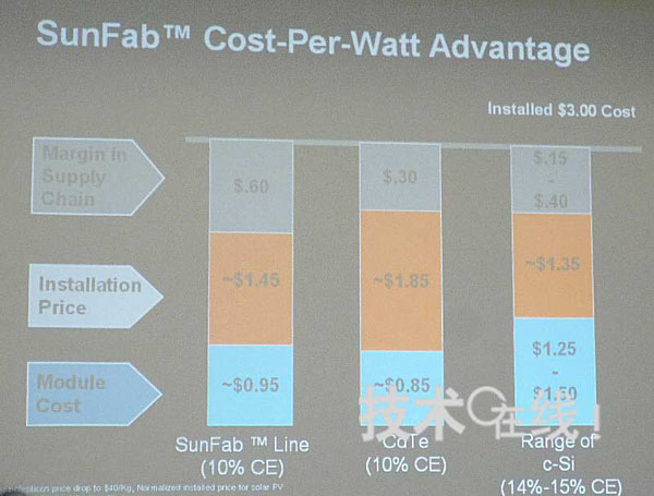 美国应用材料估计2010年底太阳能电池的导入成本为3美元/W。届时,与CdTe太阳能电池及结晶硅太阳能电池相比,该公司转换效率达到10%的大尺寸薄膜硅太阳能电池具有更高的竞争力。