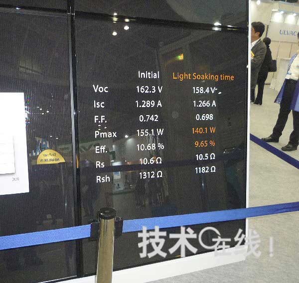 日本爱发科展示了由该公司位于茅崎的试制线制造的转换效率为9.65%的模块。模块尺寸为1.1m×1.4m,稳定前的转换效率为10.68%。目前该公司还在以转换效率超过10%为目标继续进行开发。该公司表示,随着转换效率的提高,还会迅速准备好TCO(导电性透明氧化物)形成装置。(记者:河合 基伸)