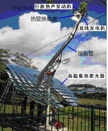 中科院理化所及其在深圳成立的中科力函热声工程技术公司近日研制出国际上第一个采用太阳能直接驱动的热声发电系统,该系统主要由太阳能高温集热聚光器、热声发动机以及往复直线发电机三个单元构成(如上图所示),输出电功率设计峰值1kW。经过初步组装调试,整机系统现已成功工作,并有数百瓦的电力输出。目前,国外热声发电的最高功率为58W,为美国Los Alamos国家实验室研制,采用电加热器作为模拟热源。