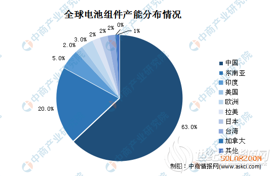 市场份额占比超六成我国光伏企业在海外投资初期多为投资成本少、自动化程度较高的组件制造厂,从2016年起,随着我国海外组件厂运转逐渐步入正轨,企业投资重点开始向上游电池片制造延伸。根据中国光伏行业协会的统计,2018年底海外布局的电池片有效产能达到12.2GW,组件有效产能达18.1GW。光伏电池组件产能市场占比超全国市场的六成。