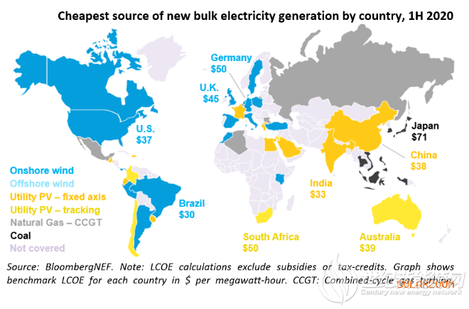 2019年太阳能光伏发电和陆上风能是目前全球至少三分之二人口的最便宜的新建发电来源。其中,在各类发电技术中光伏发电成本最低的国家包括:印度(33美元/兆瓦时)、中国(38美元/兆瓦时)、澳大利亚(39美元/兆瓦时)、南非(50美元/兆瓦时)。