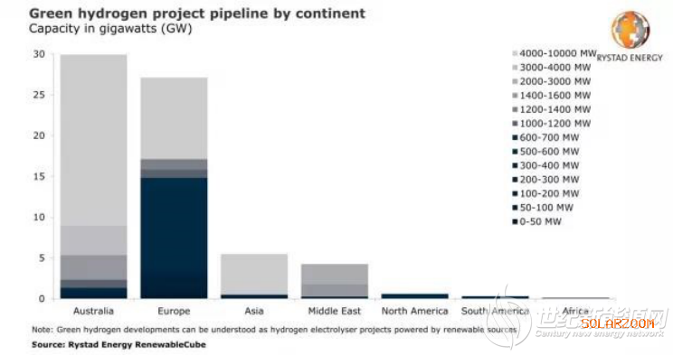 图表:澳大利亚和欧洲在全球绿色氢项目中占主导地位,拟建11个共计逾1GW的电解项目。来源:Rystad Energy Renewablecube