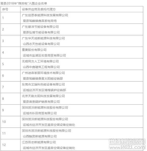 根据《夏县2018年冬季取暖“煤改电”专项行动方案》(夏政办发[2018]28号)文件安排,结合中国建筑节能协会电能供热专业委员会的评估论证成果《山西省运城市夏县清洁取暖“煤改电”技术产品选型应用推荐目录》,并经8月13日全县2018年冬季取暖“煤改电”工作领导小组会议研究决定,现将2018年夏县“煤改电”入围企业名单公告如下:《夏县2018年“煤改电”入围企业名单》附后。