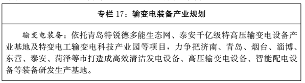 特变电工、山东达驰等企业为主体,抓住国家鼓励发展超高压、特高压、智能电网和煤改电等重大机遇,加快特高压及超高压输变电设备、智能变电站成套装备、智能配电网成套设备、用户端智能化成套装备和能源互联网核心装备等相关产业发展,建设全国高端智能输变电装备生产基地。进一步支持中小型企业技术创新,在强弱电控制设备、自动控制装置等低压电器设备领域取得技术突破,加大在线检测、智能分析等技术在设备制造中的应用。引进一批行业领先的智能电网企业,深化与本省企业合作,在数字化变电站、智能配电网设备、电网智能调控等智能输变电领域实现技术创新,提升我省电力装备企业的整体竞争力。