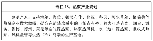 3.热泵产业。稳步发展浅层土壤源、海水源热泵,大力发展低温空气源热泵、热泵热风机,积极发展污水源热泵、吸收式热泵,进一步提升热泵产业层次和规模,形成从主机制造、零部件制造、关键设备配套、技术服务等完整产业链,打造青岛、烟台、潍坊、淄博、德州、莱芜等热泵产业集群,进一步巩固我省在全国热泵强省产业地位。以“中国制造2025”“互联网+工业”为依托,借鉴青岛海尔等清洁能源智联工厂建设新模式,积极推动“互联网+智慧工厂”“互联网+智能制造”建设,促进热泵产业智慧化生产。