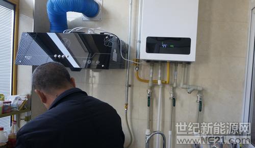 图:山西某村民正用燃气灶烧水,一旁的壁挂炉显示供暖温度
