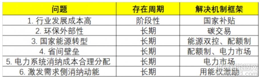 在分析变化前,首先对可再生能源面临的短期、长期问题,及解决机制提炼如下: