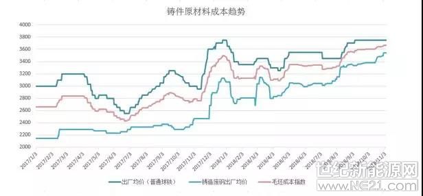 高纯、超纯的球墨铸铁,配合一定比例的高性能废钢,再加上环氧树脂,是风机轮毂、机舱、主轴铸件的重要原材料,占据了成本的大头。铸铁从2018年初的3400元/吨到11月底的4500元/吨,高达30%的涨幅让风机铸件供应商苦不堪言。