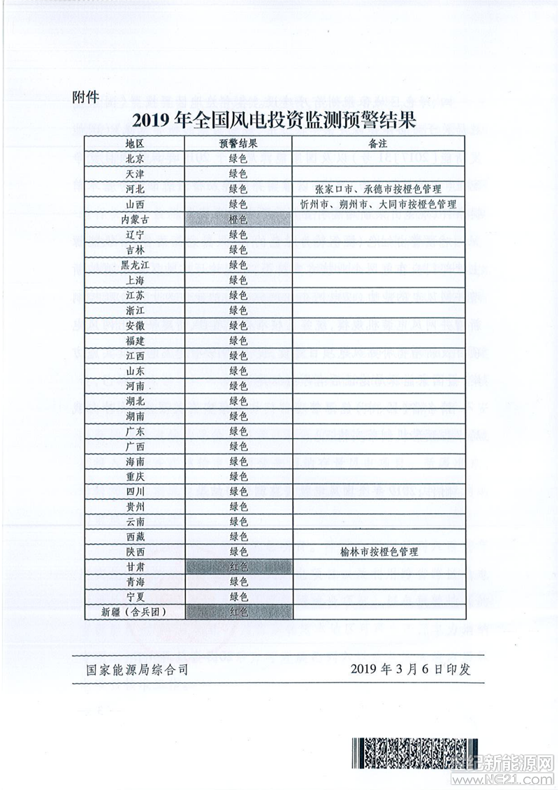 国家能源局关于发布2019年度风电投资监测预警结果的通知 国能发新能〔2019〕13号
