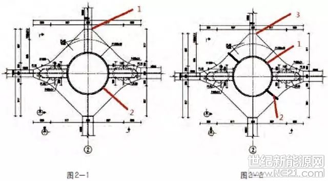 现场环板焊接的顺序为先进行环板与梁的焊接再进行环板与立柱的焊接(详见图2-1),这样的施工顺序将会导致在进行环板与立柱焊接时应力无处释放,增加应力裂纹产生的风险,建议采用如下施工顺序:将环板分成两块,先进行环板与立柱的焊接,在进行环板对接位置的焊接,最后进行梁与环板的焊接(详见图2-2),这样最大程度减少环板与立柱焊接产生的应力,降低应力裂纹产生的风险。