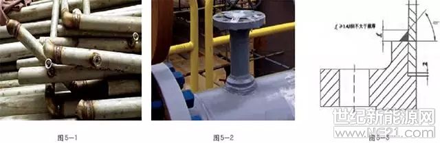 现场施工过程中,对于管线焊接,采用的是在管壁上直接开孔(详见图5-1);对于直径仅有20mm左右的管线进行对接焊接(详见图5-1)。对于此两种情况,应该分别采用增加管座(详见图5-2)和管箍插焊的方式(详见图5-3)。