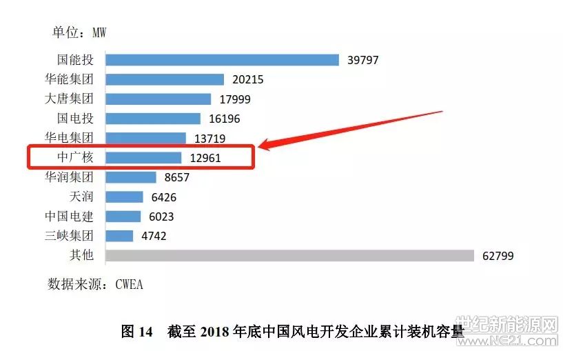 据中国风能协会数据显示,截止2018年底,中广核2018年年度新增风电装机1171MW,累计风电装机达12961MW,位列中国风电开发商第六位。