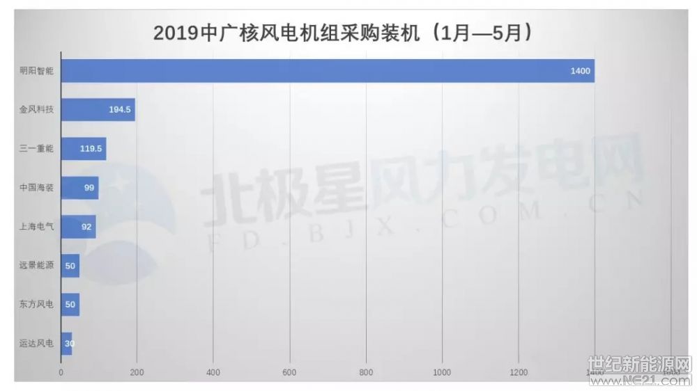 据北极星风力发电网统计,2019年1至5月份,中广核共采购风电机组达2035MW,涉及12个风电项目,其中包含2个海上风电项目。