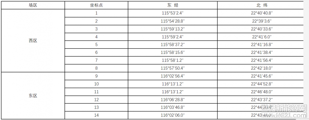 中广核汕尾后湖风电场工程场址范围坐标如下: