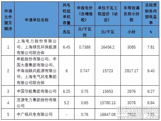 奉贤海上风电项目竞争配置申请汇总表