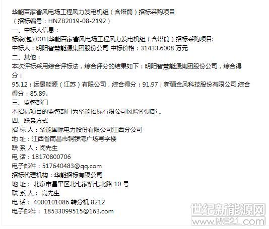 华能百家畲风电场工程风力发电机组(含塔筒)招标采购项目近日开标,中标人为明阳智慧能源集团股份公司 中标价格31433.6008 万元。
