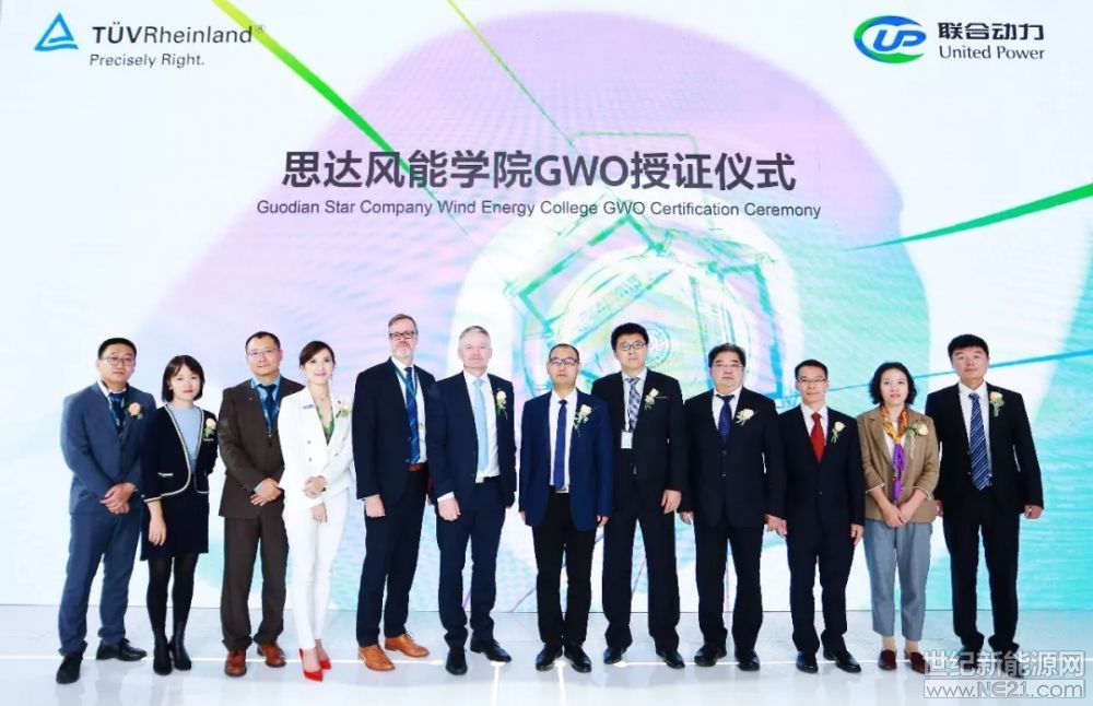 联合动力董事长、总经理申艳杰、思达公司总经理王洪斌, GWO CEO Jacob Lau Holst、德国莱茵TüV风电业务副总裁 Wolfgang Spahn、德国莱茵TüV大中华区工业服务副总经理朱国、德国莱茵TüV大中华区工业服务副总经理方菁、德国莱茵TüV大中华区工业服务项目经理顾楠共同出席授证仪式,王洪斌代表思达公司接受证书。