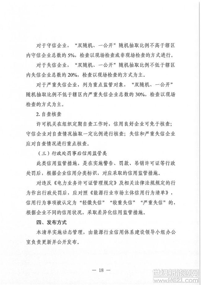 《通知》旨在深入推进能源行业信用体系建设,探索建立贯彻事前、事中、事后全过程的以信用为基础的新型监管机制,实现“信用管终身”,切实提升监管水平,促进高质量发展。《通知》指出,要及时记录和归集信用信息,全面应用信息分类等级,规范实施信用分类监管措施。根据《通知》,派出能源监管机构要在电力业务许可事前、事中、事后监管全过程,加强信用等级评定结果应用。