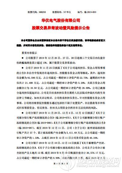 据北极星风力发电网了解,12月25日,华仪电气收到公司股票停牌警示,实施其他风险警示后的股票简称:ST华仪。