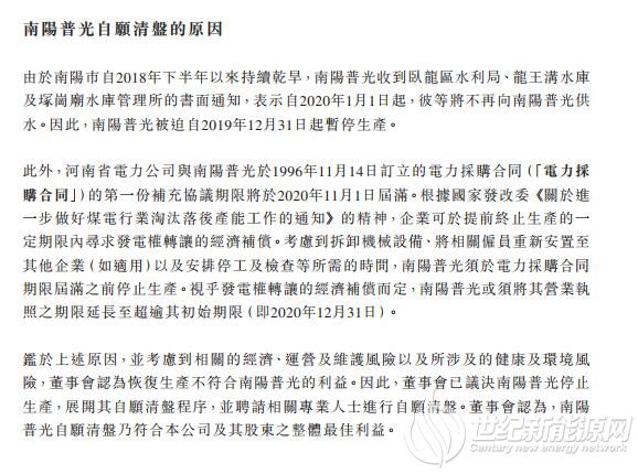 由于南阳市自2018年下半年以来持续乾旱,南阳普光收到卧龙区水利局、龙王沟水库及塚岗庙水库管理所的书面通知,表示自2020年1月1日起,彼等将不再向南阳普光供水。因此,南阳普光被迫自2019年12月31日起暂停生产。