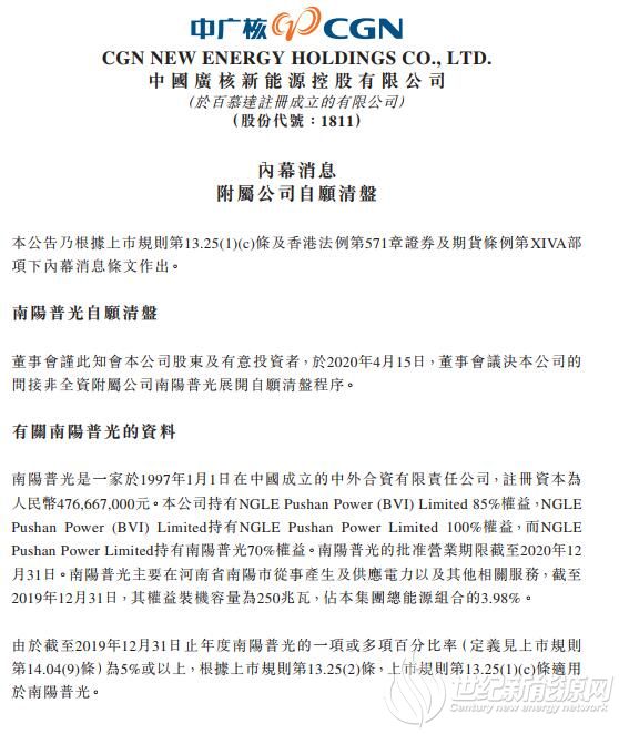 南阳普光是一家于1997年1月1日在中国成立的中外合资有限责任公司,注册资本为人民币4.77亿元。公司持有NGLE Pushan Power (BVI) Limited 85%权益,NGLEPushan Power (BVI) Limited持有NGLE Pushan Power Limited 100%权益,而NGLEPushan Power Limited持有南阳普光70%权益。南阳普光的批准营业期限截至2020年12月31日。南阳普光主要在河南省南阳市从事产生及供应电力以及其他相关服务,截至2019年12月31日,其权益装机容量为250兆瓦,占集团总能源组合的3.98%。