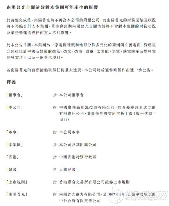 于清盘完成后,南阳普光将不再为公司的附属公司,而南阳普光的财务业绩及状况将不再综合计入集团。董事会预期南阳普光自愿清盘将不会对集团的财务状况及业务营运造成任何重大不利影响。