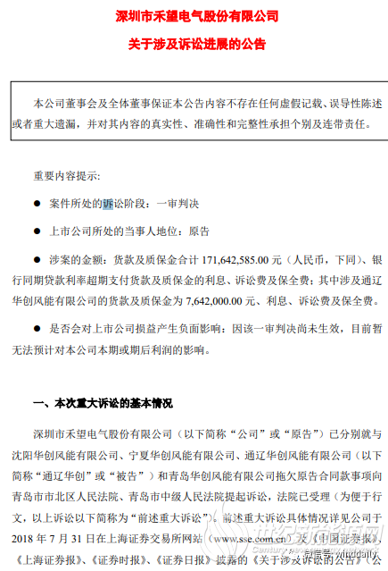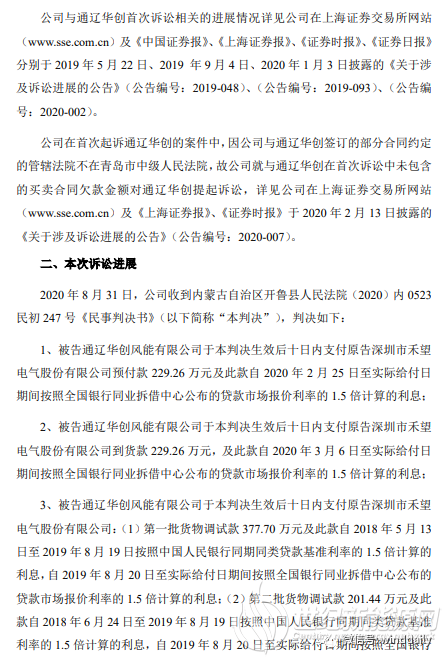 WindDaily获悉,禾望电气-华创风能货款纠纷案有了最新进展,涉案总金额1.72亿元。8月31日,禾望电气收到内蒙古自治区开鲁县人民法院的一审判决结果:华创风能通辽公司将在10日内支付给禾望电气总计1299.14万元。此外,禾望电气在青岛中级人民法院对华创风能的诉讼已受理。以下为公告原文: