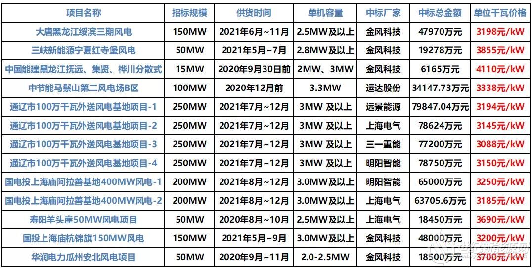 4个在2020年供货的项目机组价格都在3690元/kW,5个在2021年供货的项目机组价格在3088元/kW~3250元/kW。