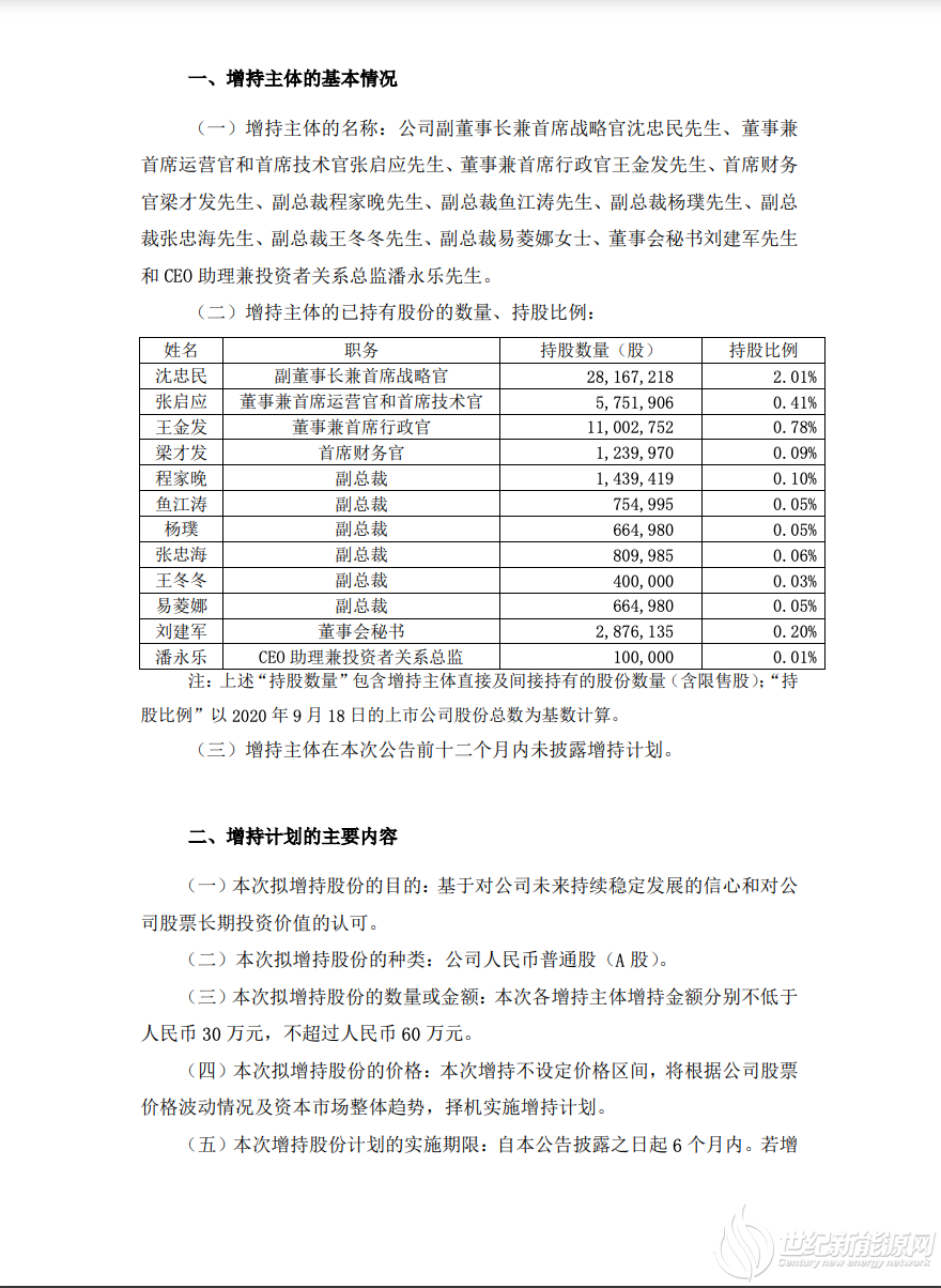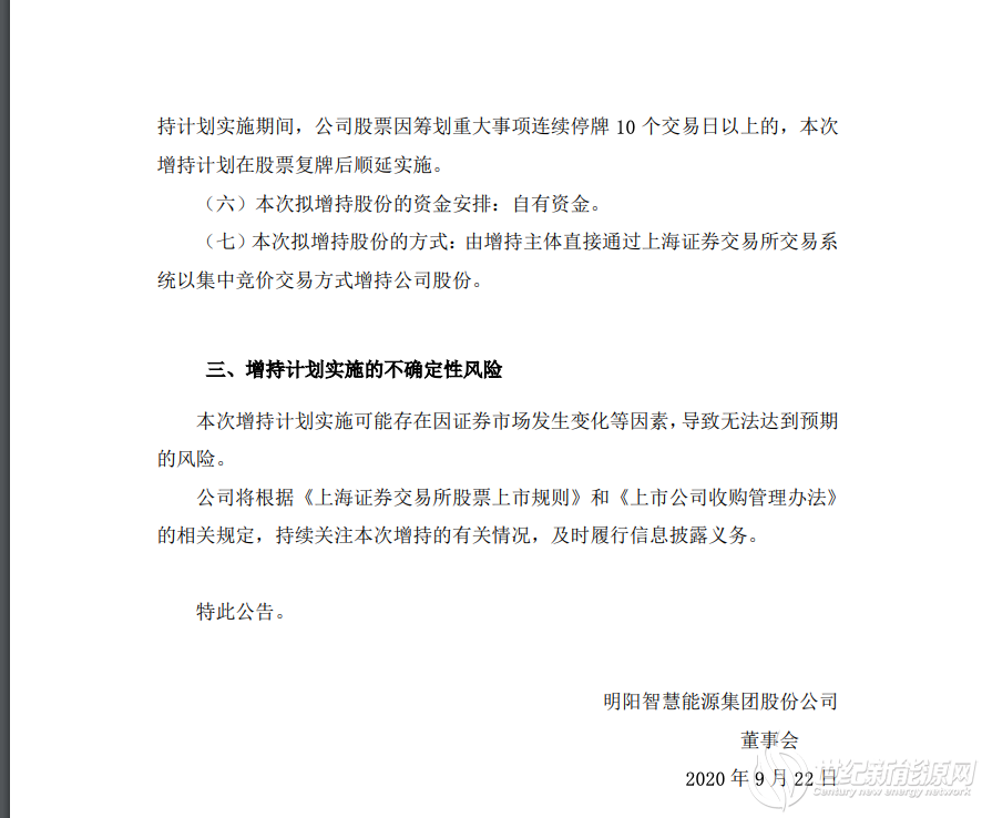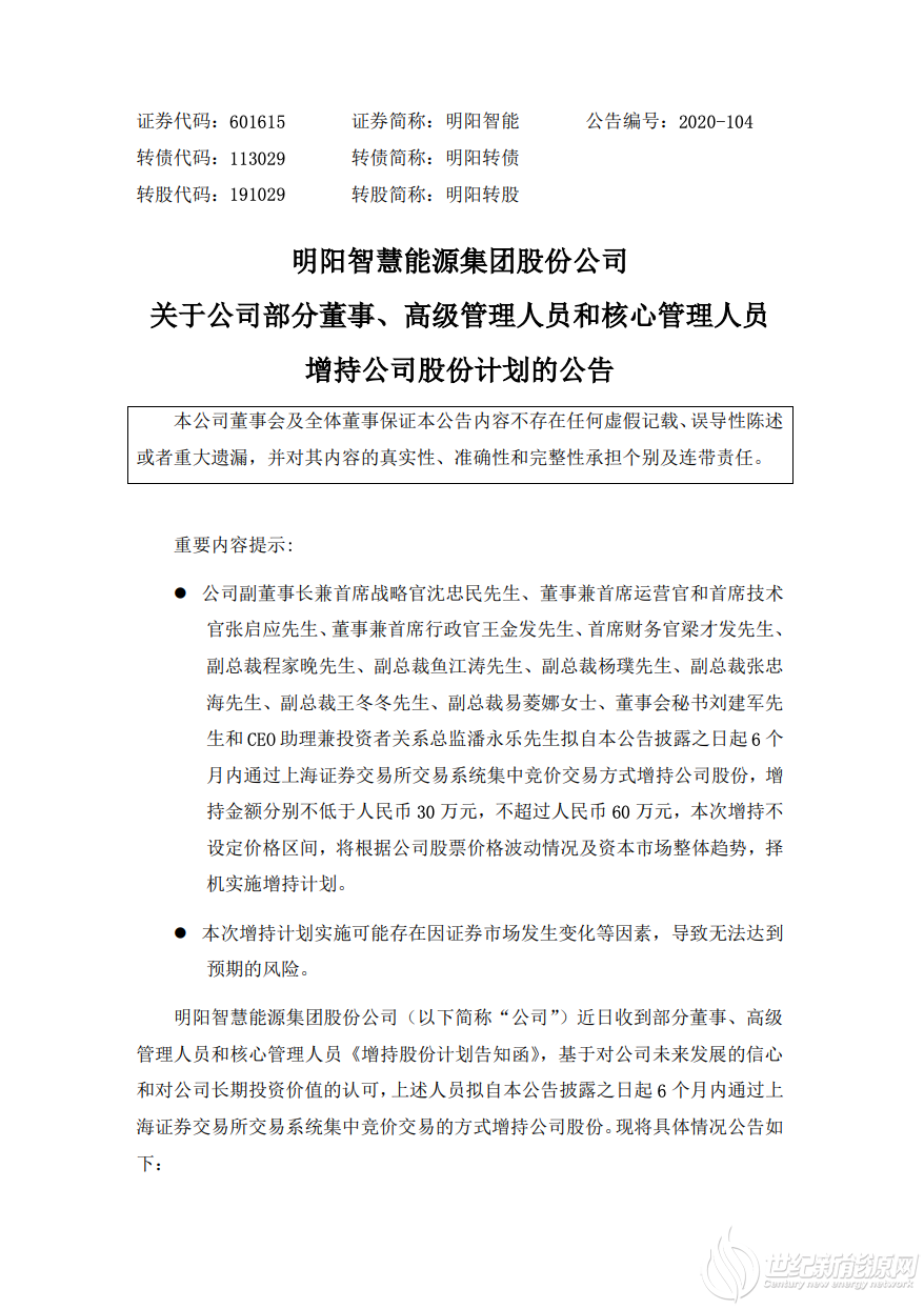 9月21日,明阳智能发布公告成称,公司副董事长兼首席战略官沈忠民、董事兼首席运营官和首席技术官张启应、董事兼首席行政官王金发、首席财务官梁才发、副总裁程家晚、副总裁鱼江涛、杨璞等12人,拟6个月内通过集中竞价交易方式增持公司股份,增持金额分别不低于30万元,不超过60万元。
