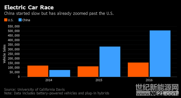 中美2014-2016年电动汽车销量对比,起步虽晚但迅速超越美国