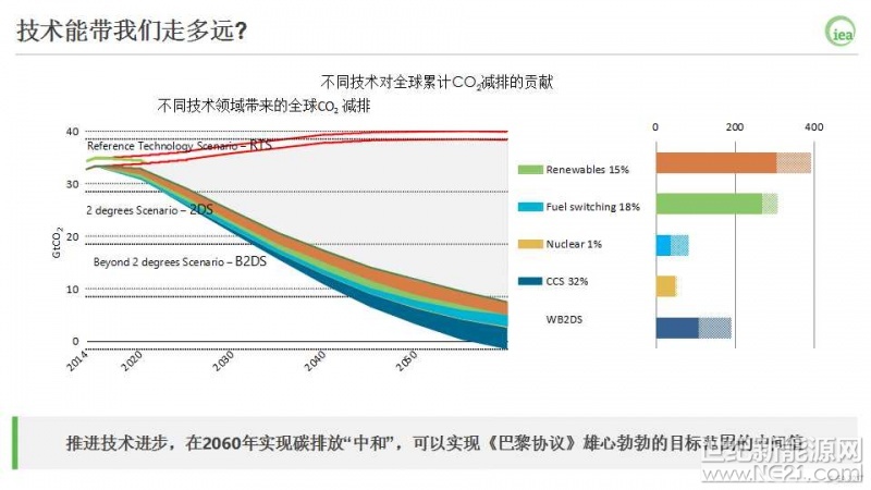这需要采用一系列的技术才能实现。按照国际能源署的研究,能效可以贡献其中40%的减排量,接着是可再生能源的35%,以及 CCS的14%.