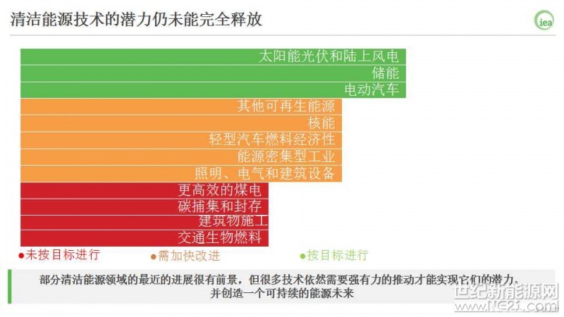 IEA 的《追踪清洁能源技术进展》 (TCEP)报告每年都会评估最新的技术进步和市场发展,跟踪总体进展,并对未来行动提出建议。今年的TCEP 报告显示,我们选择的26项清洁能源技术中,只有3项处在可以实现能源可持续转型的路径上。 15项技术只显示出一定的进步,8项完全没有按照目标进行,需要新的行动。