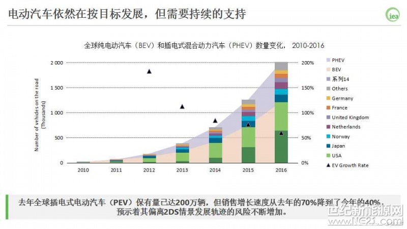 虽然增速从2015年的70%降到2016年的40%,但电动汽车依然处于实现2DS 情景2025年目标的轨迹上,但(增速的降低)对实现 2DS情景在2020年的中期目标产生威胁,并有可能进一步影响2025年目标的实现。