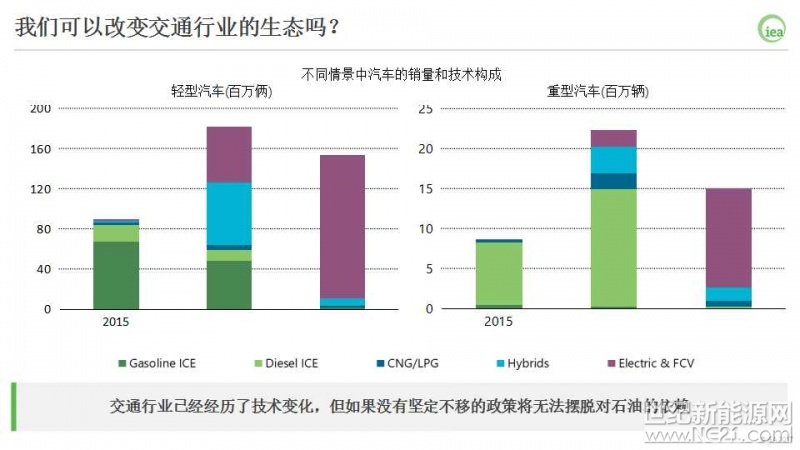 如果看轻型轿车市场,如果要实现B2DS情景的政策目标,该行业2060年73%的能源消费需要由电力来提供。