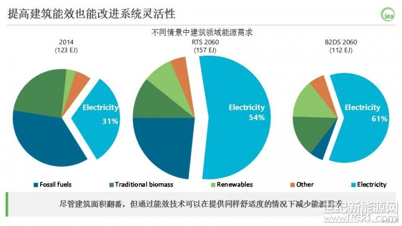 在B2DS情景, 通过转向高效、低碳的技术不仅可以带来更低的能源需求,还可以在使用比RTS情景更少的电力的情况下实现更高水平的建筑电气化。