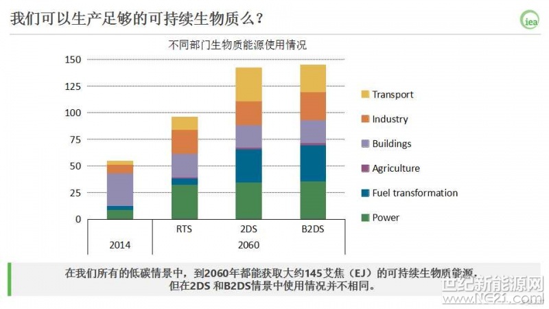 在2DS和B2DS情景中模拟生物质能源的角色时,考虑到能持续获取的生物质原料数量的限制,总的可获取的生物质供应被限定在145 EJ。
