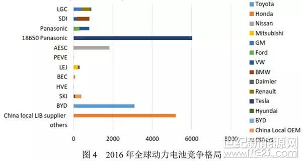 目前全球动力电池配套的配套供应商主要集中于日、韩、中三国,2016年锂动力电池竞争格局为:日系、韩系新能源汽车配套日韩主机厂控股或合资合作的动力电池企业产品;美系新能源汽车配套日韩动力电池企业产品,其中特斯拉正在筹建自己的超级动力电池工厂;欧系新能源汽车配套日、韩、中三国领先的动力电池企业产品。这些整车厂的纯电动与插电式混动汽车都至少选择了2~3家动力电池供应商。