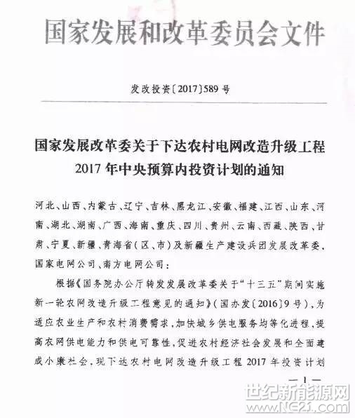 根据《国家发展改革委关于下达农村电网改造升级工程2017年中央预算内投资计划的通知》(发改投资〔2017〕589号),现下达我省农村电网改造升级工程2017年中央预算内投资计划175000万元。其中:中央预算内投资35000万元,银行贷款140000万元。工程建设规模:新建改造35kV变电站5座,新增主变容量31.5MVA,新建35kV线路45.32km;新建(改造)10kV线路2342.03km,配变台区5377台/787.52MVA,配套建设改造低压线路11932km。总项目62个,涉及62个县。